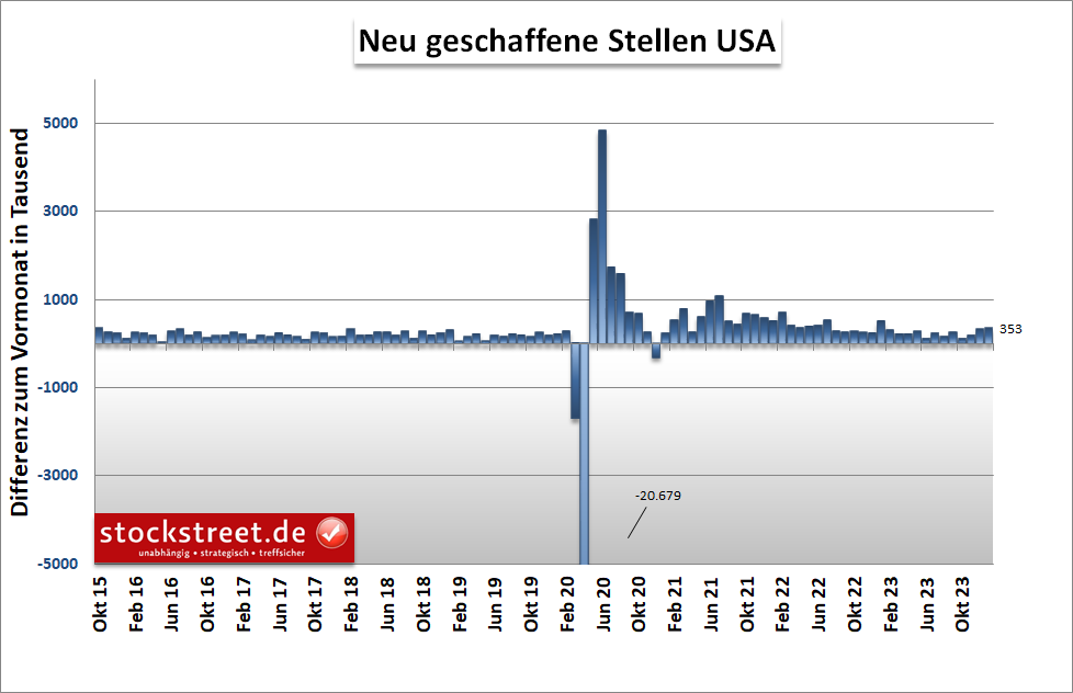 Das Stellenwachstum legte im Januar sogar noch zu. Die Unternehmen meldeten 353.000 neue Jobs (außerhalb der Landwirtschaft). Experten hatten dagegen im Durchschnitt lediglich mit 180.000 gerechnet. Zudem wurde der Vormonatswert um satte 117.000 Stellen nach oben revidiert. Statt 216.000 wurden im Dezember 333.000 neue Arbeitsplätze gemeldet. Dass auch der Novemberwert um 9.000 (auf 182.000) angehoben wurde, spielt bei derart hohen Zahlen schon fast keine Rolle mehr.