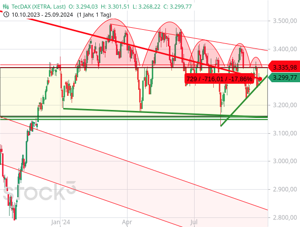 Lediglich im sehr kurzfristigen Bereich gibt es höhere Hochs (dicke grüne Aufwärtslinie). Um hier einen bullishen Eindruck zu vermitteln, muss der Index aber zumindest über das Hoch von Ende August bei rund 3.400 Punkten steigen, und das möglichst dynamisch.