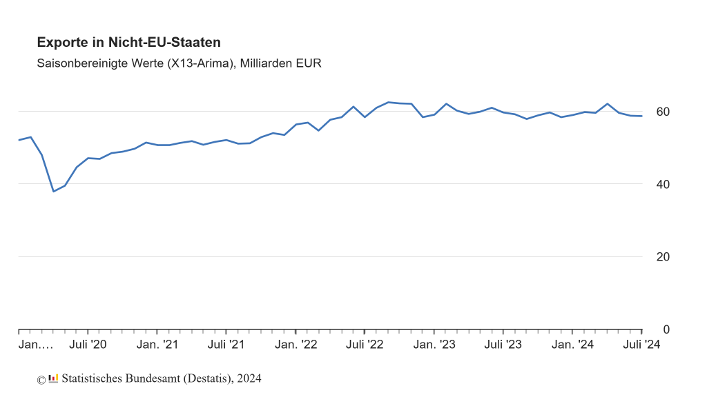Auch das US-Geschäft schrumpfte im August. In die Vereinigten Staaten wurden Waren im Wert von 12,6 Milliarden Euro geliefert. Das sind immerhin 3,2 % weniger als im Vorjahresmonat. Insgesamt sind die deutschen Exporte in Staaten außerhalb der Europäischen Union (Drittstaaten) im August um 4,8 % zum Vorjahresmonat auf 55,2 Milliarden Euro gesunken.