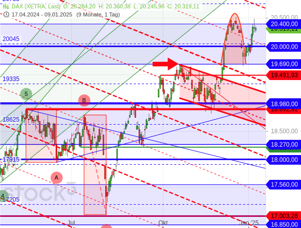 Vorerst sieht es charttechnisch aber sehr gut aus für den deutschen Aktienindex. Denn ein Rutsch unter das Hoch vom Oktober 2024 (siehe roter Pfeil im folgenden Chart) wurde verhindert. Stattdessen konnten die Bullen den DAX bereits wieder bis zur Rechteckgrenze bei 20.400 Punkten treiben. Diese Marke stellt allerdings derzeit offenbar erneut eine zu hohe Hürde für die Bullen dar, wie schon bei der Wende vom Jahresende (roter Bogen).