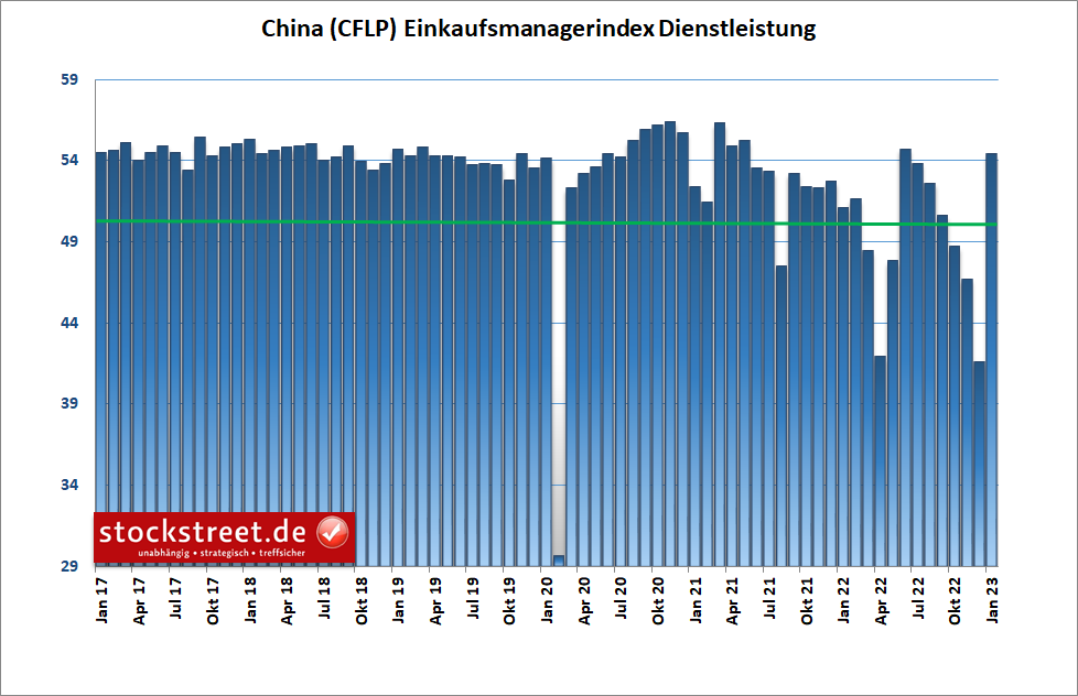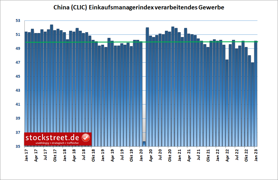 Gleiches gilt für die wirtschaftliche Erholung in China, die sich nach den Lockerungen bzw. Aufhebungen der Corona-Maßnahmen abzeichnet. Laut den gestern veröffentlichten Einkaufsmanagerdaten ist die chinesische Wirtschaftsaktivität im Januar unerwartet bereits auf den Wachstumspfad zurückgekehrt. Der offizielle Einkaufsmanagerindex (PMI) des verarbeitenden Gewerbes stieg auf 50,1 Punkte, von 47,0 im Vormonat.