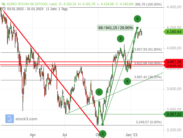 Das Problem an der Sache ist, dass in beiden Indizes die Kurserholung binnen eines relativ überschaubaren Zeitraums sehr weit gelaufen ist. Beim Euro STOXX 50 haben wir es seit dem Tief vom 13. Oktober mit einem Kursanstieg um fast 30 % zu tun. Und ausgehend vom Tief des 29. Septembers lässt sich die Erholung 5-gliedrig zählen. Aus Sicht der Elliott-Wellen-Theorie kann man daher eine baldige (ABC-)Korrektur erwarten.