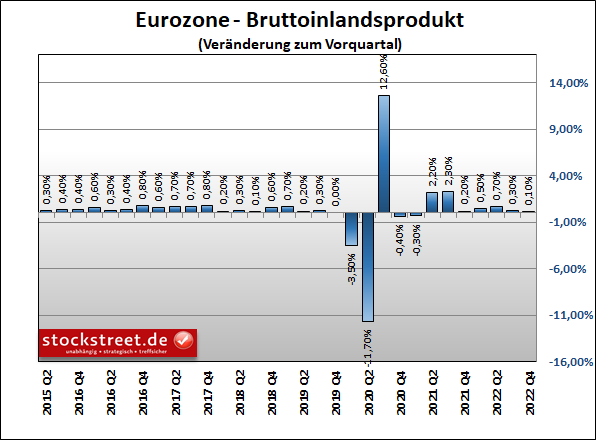 Nach dem Anstieg im 3. Quartal um 0,3 % hat sich das Wachstum damit zwar weiter abgeschwächt, einer Rezession scheint die Eurozone aber vorerst entgehen zu können. Experten hatten dagegen für das Schlussquartal 2022 bereits mit einem Minus von 0,1 % und auch für den Jahresauftakt mit einer Schrumpfung der Wirtschaft gerechnet. Damit wären die Voraussetzungen für eine technische Rezession erfüllt gewesen.
