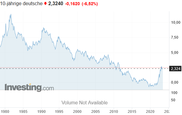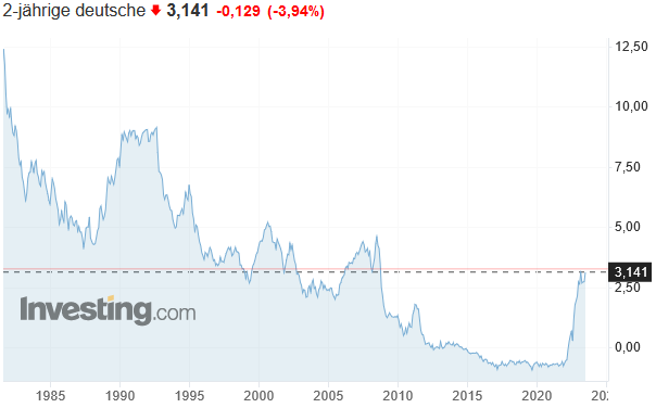 Auch hier kam es gestern zu einem kräftigen Rücksetzer, der (mit mehr als 6 %) sogar wesentlich stärker ausfiel als bei den 2-jährigen, da aufgrund der schwachen Konjunkturdaten umso mehr erwartet wird, dass die EZB die Leitzinsen nach der Inflationsbekämpfung senken wird.