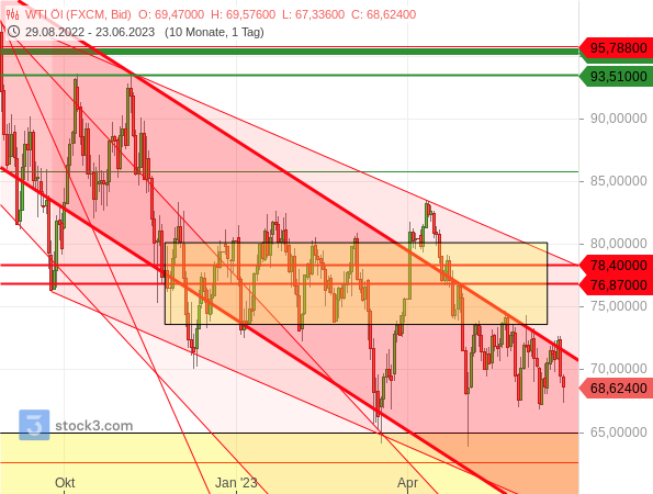 Neben den Anleihemärkten haben übrigens auch die Ölpreise frühzeitig auf die wirtschaftliche Schwäche reagiert. Und mit den Preisrückgängen von vorgestern und gestern prallte die US-Sorte-West Texas Intermediate (WTI) an der oberen Linie des derzeit herrschenden Abwärtstrendkanals ab und droht nun wieder auf neue Tiefs zu fallen – trotz der Förderkürzungen der OPEC+.