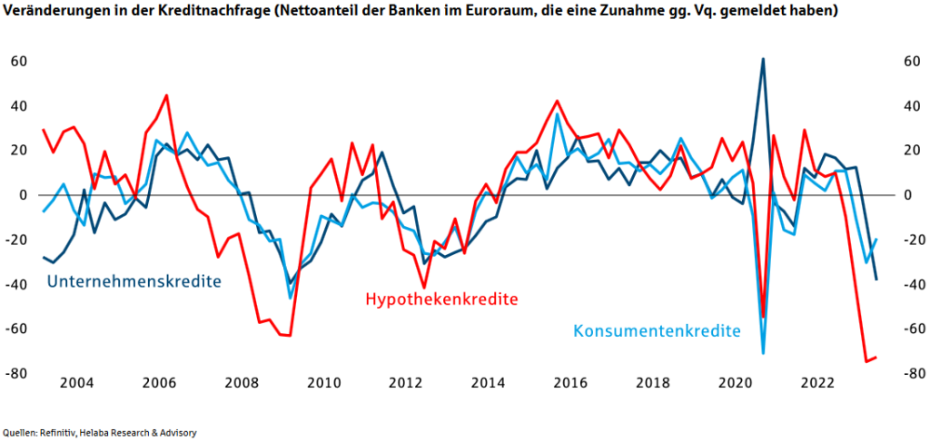 Dabei sind Bremsspuren schon jetzt deutlich erkennbar. Wie die folgende Grafik zeigt, hat die Kreditnachfrage bereits deutlich nachgelassen. Das ist natürlich ein Ergebnis der gestiegenen Zinsen, welche die Kreditkosten erhöhen.