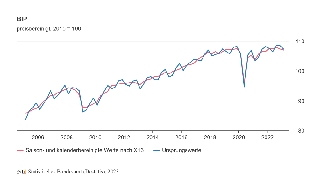 Und so passt der Kursverlauf des DAX-Kursindex sehr gut sehr gut zur Entwicklung des BIP. Denn aktuell notiert der Kursindex kaum höher als 2017. Und das gilt auch für das deutsche Bruttoinlandsprodukt.