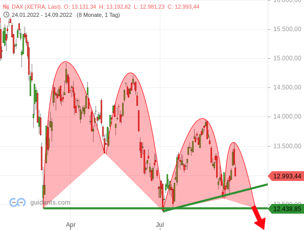 Aber im Grunde macht dies die Sache nicht besser. Der Index würde damit lediglich etwas länger um die psychologisch wichtige Marke von runden 13.000 Punkten pendeln, statt sich zur horizontalen Unterstützung unterhalb von 12.500 Zählern zu orientieren (dicke grüne Linie). Doch auch die Dreiecksformation ist bearish zu werten und lässt neue Korrekturtiefs erwarten. Die längerfristigen Perspektiven sprechen also so oder so für bald weiter fallende Kurse.