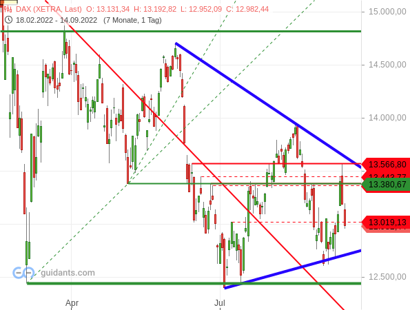 Und auf der Oberseite ist die Abwärtslinie des Dreiecks entscheidend. Wird diese gebrochen, wird das Szenario neuer Korrekturtiefs weniger wahrscheinlich. Unwahrscheinlich wird es aber erst, wenn das (Zwischen-)Hoch vom 16. August bei 13.947,85 Punkten überwunden wird.