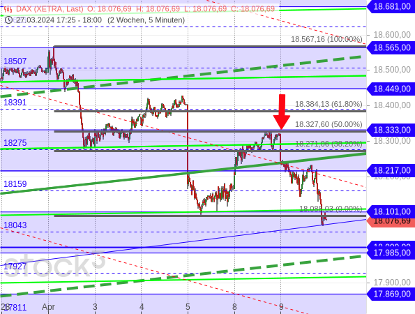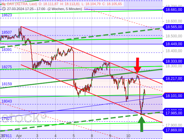 Der DAX ist also tatsächlich noch über die Konsolidierungslinie geklettert, bevor er an der oberen Linie des aktuellen Abwärtstrendkanals abprallte (siehe roter Pfeil im Chart) und dann aufgrund der enttäuschenden Inflationsdaten bis zur unteren Trendkanallinie durchgereicht wurde. Dort setzte eine Kurserholung ein (grüner Pfeil), die fast bis zur Konsolidierungslinie (rot gestrichelt) zurückführte. Somit setzt sich die Konsolidierung wie erwartet fort. Und eine schärfere Korrektur ist nach wie vor nicht in Sicht.