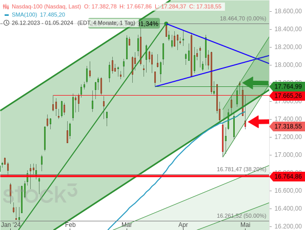 Der atemberaubende Wechsel zwischen bullishen und bearishen Signalen hat sich in dieser Woche fortgesetzt. Am Freitag berichtete ich bereits, dass der Nasdaq 100 seinen alten Aufwärtstrendkanal zurückerobern konnte und sich dabei im sehr kurzfristigen Bereich höhere Hochs und Tiefs bildeten, also ein Aufwärtstrend vorlag (siehe grüne Linien im folgenden Chart). Das war nach den zuvor bearischen Signalen bullish zu werten. Am Montag eroberte der Technologieindex auch noch das Tief der Dreiecksformation (blaue Linien) bei 17.764 Punkten zurück (siehe grüner Pfeil), womit das nächste bullishe Signal gesendet wurde.