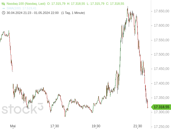 Dabei ist die Marktrichtung nicht nur über mehrere Tage betrachtet sehr wechselhaft, sondern auch im Intraday-Bereich. In der Wochenausgabe des Börsenbriefs „ Börse-Intern-Premium” war gestern bereits zu lesen, dass die Kurse an den US-Börsen nach dem vorgestrigen Zinsentscheid der US-Notenbank (Fed) und während der nachfolgenden Pressekonferenz mit Fed-Chef Jerome Powell zunächst um weit mehr als 1 % anstiegen. Doch nachdem Powell den Pressevertretern Rede und Antwort gestanden hatte, drehten sie nach unten und gaben sämtliche Gewinne wieder ab, wie der folgende Chart des Nasdaq 100 zeigt.