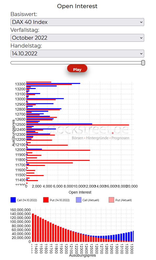 Der DAX hat sich beim aktuellen Stand von 12.655 Punkten schon wieder ein gutes Stück aus dem bearishen Bereich herausgearbeitet, in dem er noch in der Vorwoche beim Tief von 12.000 Punkten stand. Er hat sich damit schon ordentlich von den beiden größten Call- (blau) bzw. Put-Positionen (rot) abgesetzt, die bei 12.500 Punkten liegen.