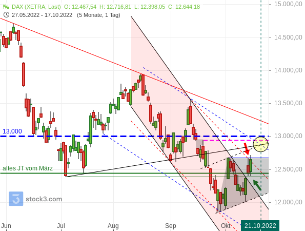 Die Vielzahl der genannten Kursmarken bestätigt das oben Gesagte: Im Oktober ist der Einfluss der Verfallstagspositionierung im Vergleich zu allen anderen Faktoren eher gering. (Ausnahme: kurzfristig nach einem nachhaltigen Anstieg über 12.500 Punkte, wie wir gestern gesehen haben) Immerhin gibt es in dieser Woche auch keine allzu wichtigen Konjunkturdaten, aber dafür viele Quartalszahlen der Unternehmen.