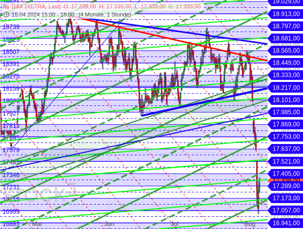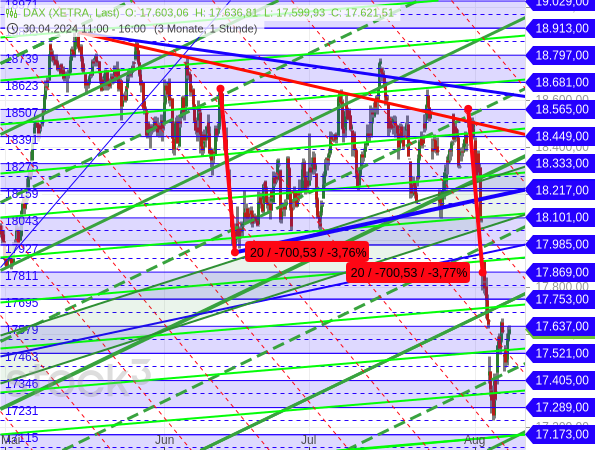 „Am 14. Juni hatte der DAX auch schon einmal die Rechteckgrenze bei 17.985 Punkten unterschritten. Auch damals war er mit hoher Dynamik aus einem Konsolidierungsbereich nach unten ausgebrochen. Es folgte eine flache Aufwärtsbewegung, die zunehmend volatil wurde und dadurch viele Fehlsignale verursacht hatte.