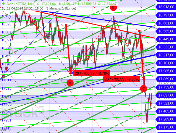 Ich möchte mit Blick auf diesen Chart bzw. Kursverlauf auch noch zu bedenken geben, dass eine ABC-Korrektur des DAX möglich war. Auch das hätte zu einem schnellen Wiederanstieg führen können, nachdem die jüngste Abwärtswelle das gleiche Ausmaß angenommen hatte wie die von Mitte Juni (Prinzip der Wellengleichheit).