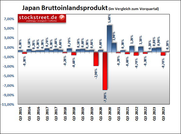 Da die Inflation bereits seit mehr als einem Jahr über dem 2 %-Ziel der Zentralbank lag, hatte die BoJ als quasi letzte Voraussetzung für diese historische Entscheidung ein kräftiges Lohnwachstum genannt. Zumal die japanische Wirtschaft im 4. Quartal 2023 nicht wie zunächst gemeldet geschrumpft, sondern gewachsen ist. Das Bruttoinlandsprodukt (BIP) stieg um 0,1 % und lag damit über der ursprünglichen Schätzung eines Rückgangs um 0,1 %.