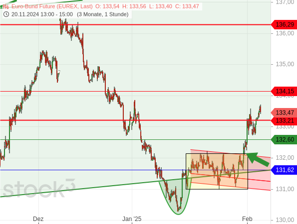 Vieles hängt davon ab, ob es zu US-Zöllen auf EU-Importe kommt und wie die Europäische Union gegebenenfalls reagiert, womöglich mit Zöllen auf US-Importe. Das könnte die Inflation anheizen und zugleich die Wirtschaft belasten. Die Europäische Zentralbank (EZB) wäre damit in einem Dilemma: Wird sie die Leitzinsen weiter senken, um die Wirtschaft zu unterstützen? Das würde den Bund-Future weiter nach oben treiben – aber auch die Inflation anheizen. Oder wird sie eine Zinspause einlegen, um zunächst die Entwicklung der Preise abzuwarten? Das würde den Bund-Future wahrscheinlich etwas belasten.