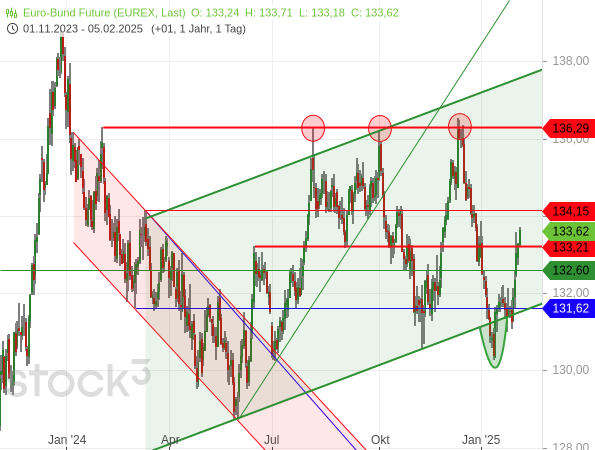 Grundsätzlich erwarte ich weiterhin einen tendenziell steigenden Bund-Future. Und selbst bei einem erneuten Rücksetzer dürfte sich das Kursgeschehen auf absehbare Zeit innerhalb einer Range von 130 bis 136 Punkten abspielen.