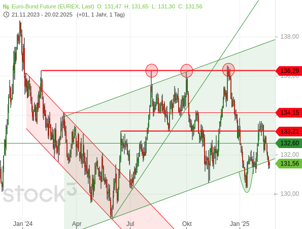 Bei der vorangegangenen Bund-Future-Analyse vom 5. Februar hatte ich geschrieben, dass man bei Rücksetzern einen beschriebenen Long-Trade noch einmal zurück ins Depot holen könnte, um auf einen erneuten Anstieg auf das damalige Niveau von ca. 133,62 Punkten zu setzen (siehe „Bund-Future: Gewinnbringende Long-Trades“). Ich glaube, dass man diesen Trade nach dem aktuellen Rücksetzer nun wagen kann.
