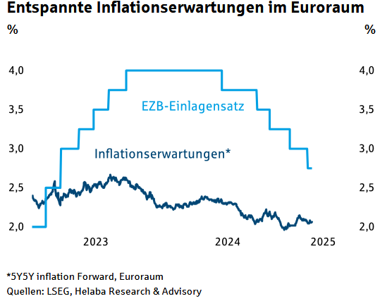 Zur Erinnerung: Der am Finanzmarkt derzeit maßgebliche Einlagensatz, einer von drei Leitzinsen der EZB, liegt inzwischen bei 2,75 %, nachdem er Anfang Juni 2024 noch bei 4,00 % lag, weil die Notenbank seinerzeit aufgrund einer nachlassenden Inflation auf einen Lockerungskurs eingeschwenkt war und seitdem ihre Leitzinsen fünfmal gesenkt hat.