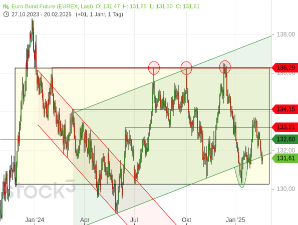 Und das dürfte für den Bund-Future bedeuten, dass sein Abwärtspotential begrenzt erscheint. Denn gewöhnlich gehen sinkende Zinsen ja mit steigendenden Anleihekursen einher.