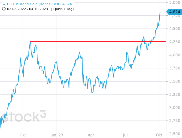 An den Anleihemärkten stiegen vor diesem Hintergrund die Renditen weiter an. Die Verzinsung der US-Treasuries mit 10-jähriger Laufzeit zog auf deutlich über 4,8 % an und setzte damit ihren steilen Anstieg fort, der sich seit der jüngsten Zinsentscheidung der Fed beobachten lässt.