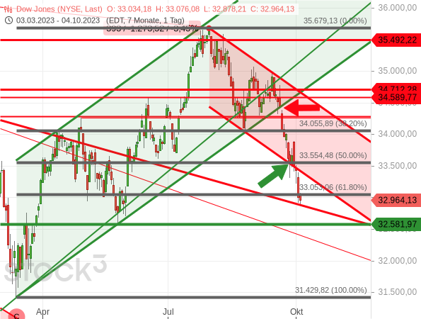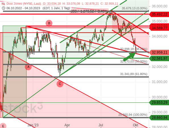 Da der Dow Jones aber seit dem 14. September von damals noch fast 35.000 Punkten binnen weniger als 3 Wochen um mehr als 2.000 Zähler bzw. 5,94 % nachgegeben hat, ist auch hier, genau wie beim Bund-Future, eine Gegenbewegung zunehmend wahrscheinlich. Zumal man die aktuelle Abwärtswelle 5-gliedrig zählen kann.