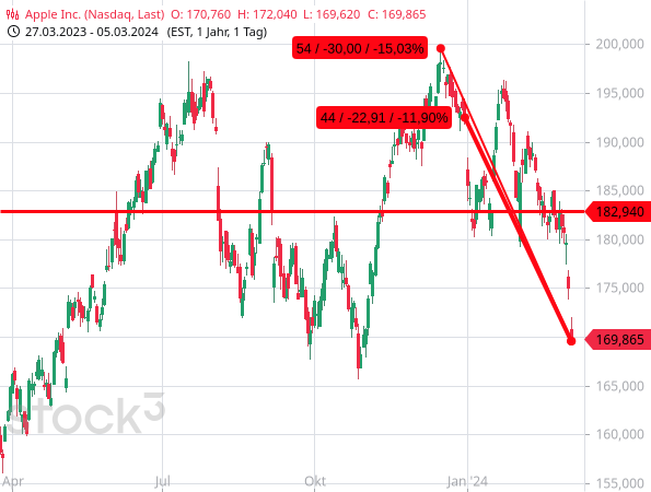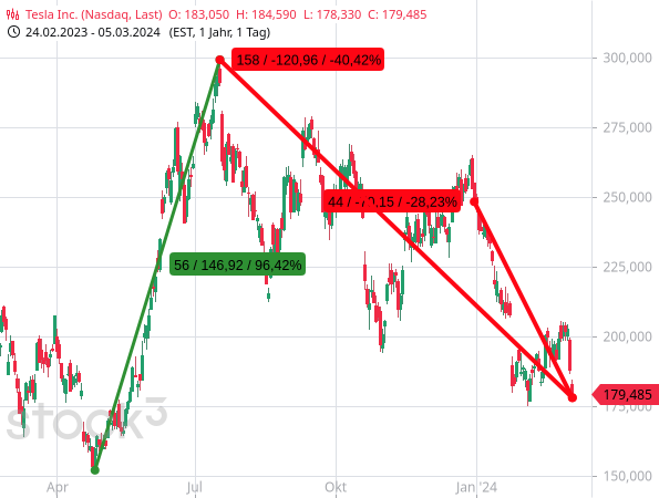 Tesla hat im selben Zeitraum sogar mehr als ein Viertel an Wert eingebüßt. Und seit dem Hoch vom Juli 2023 sind es bereits mehr als 40 %.