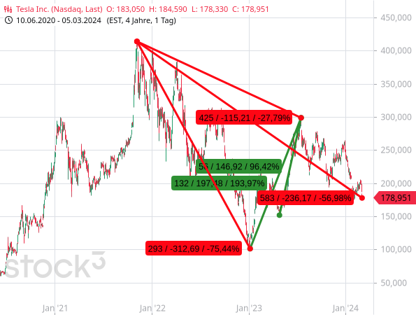 Längerfristig betrachtet sieht es noch düsterer aus (siehe folgender Chart). Denn trotz der vorherigen Kursrally um fast 100 %, erreichte die Tesla-Aktie im Juli 2023 nicht mehr das Hoch, welches Ende 2021 markiert wurde. Stattdessen drehte die Aktie bei einem Minus von immerhin noch fast 28 % wieder nach unten. Und nun liegt sie vom 2021er Hoch aus wieder mehr als 50 % im Verlust.