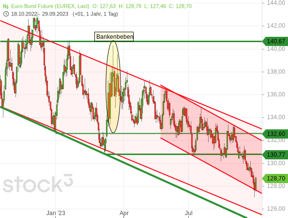 In der Börse-Intern-Ausgabe vom 17. August hatte ich geschrieben: „… wer den Analysen hier im kostenlosen Newsletter gefolgt ist, hat am oberen Ende der Range einen Long-Trade mit Gewinn beendet (siehe „Wieder übertriebene Zinsspekulationen“). Und nun könnte es sich (bald) anbieten, diesen Trade auf einem niedrigeren Niveau und somit zu günstigeren Kursen zurück ins Depot zu holen.“ Ich denke jetzt könnte man eine neue Long-Position wagen.