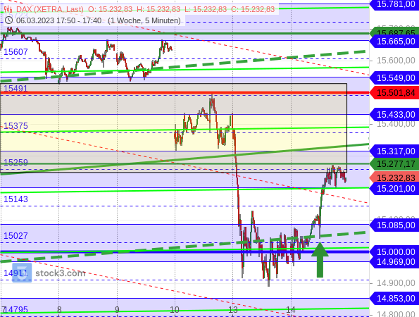Der DAX konnte dadurch sogar die Seitwärtsspanne (gelb) erreichen, in der er seit Anfang Februar seitwärts gelaufen war, bis es zu den Kursverwerfungen in Folge der SVB-Pleite kam.