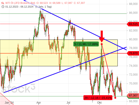 Denn trotz der Angebotskürzungen der OPEC (blaue Linie) tendierten die Ölpreise in diesem Jahr die meiste Zeit abwärts. WTI (siehe folgender Chart) erreichte zum Beispiel im April das bisherige Jahreshoch bei rund 87 US-Dollar. Und nach dem Ausbruch aus einem symmetrischen Dreieck (blaue Linien) im September scheiterte ein anschließender Rückeroberungsversuch (siehe roter Pfeil).