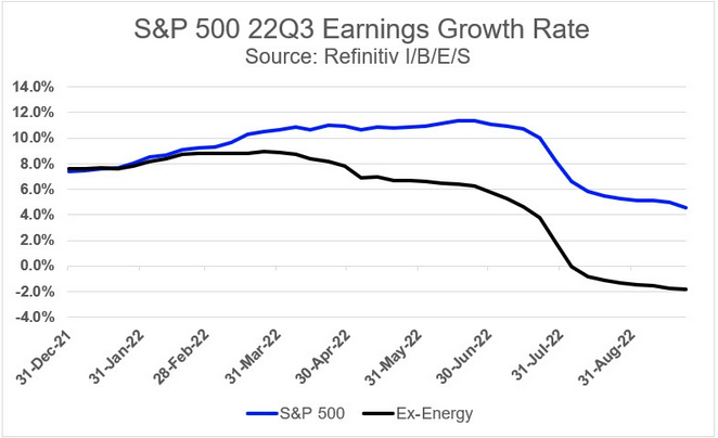 Es wäre laut Refinitiv das zweite Quartal in Folge mit negativem Wachstum, wenn es den Energiesektor nicht gäbe. So etwas hat es nur in zwei früheren Perioden gegeben: während der globalen Finanzkrise von 2008 bis 2009 und zur Corona-Pandemie 2020.