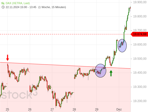 Tatsächlich begann der DAX gemächlich – zwar gab es am Donnerstag einen merklichen Sprung nach oben, aber dabei blieb der Kurs unterhalb der Oberkante des roten Konsolidierungskanals, in dem sich der Index seit seinem jüngsten Allzeithoch bewegte. Und auch am Freitag hielt sich der Kurs zunächst unterhalb dieses Widerstands (siehe untere Ellipse im folgenden Chart):