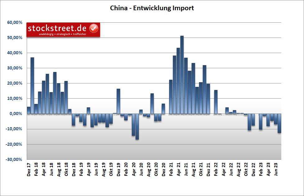 Denn die Ausfuhren der Volksrepublik sanken im Juli um -14,5 % zum Vorjahr. Damit verzeichnete die zweitgrößte Volkswirtschaft der Welt das schlechteste Exportergebnis seit Februar 2020.