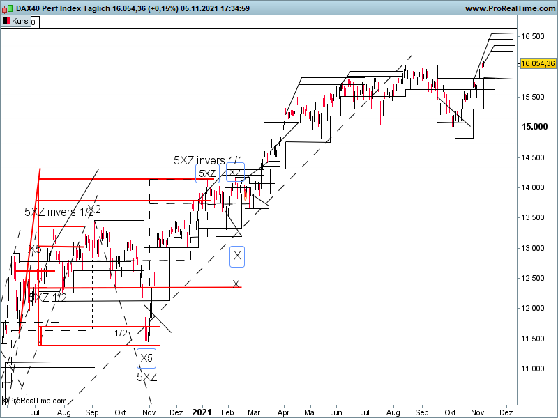 Die Tagesschlusskurse notierten seit der letzten Analyse oberhalb der Abwärtstrendmarke bei 15,804.80 Punkten, sodass neue Jahreshöchstkurse zu erwarten gewesen sind. Der Schlusskurs am Freitag, den 5.11.2021 lag bei 16.054,36 Punkten. Das Wochenhoch lag bei 16.084,90 Punkten.