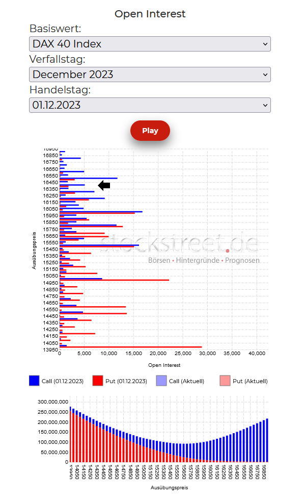 Aktuell steht der DAX bei 16.400 Punkten (siehe Pfeil), und damit liegen bereits 68,1 % der Call-Optionen im oder am Geld, dürften also (weitgehend) abgesichert sein. Das „Beschleunigungspotenzial“, das bei einem weiteren Kursanstieg des DAX durch zusätzliche Calls, die ins Geld laufen, freigesetzt wird, ist also begrenzt. (Dieser Effekt war im November ein wichtiger Faktor, warum das Verfallstags-Kursziel überrannt wurde.)