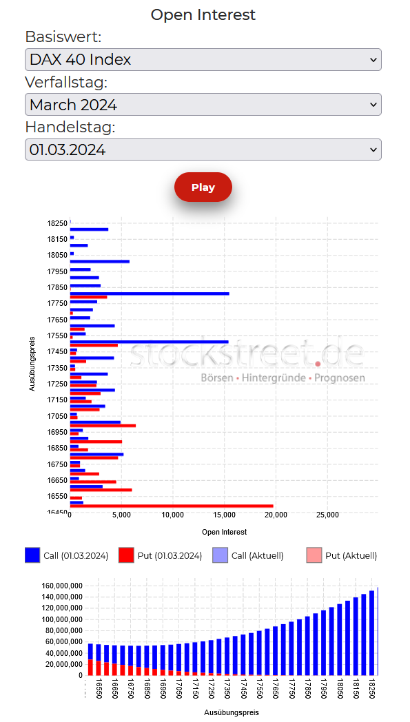 Das ist aber auch nicht erforderlich, denn die meisten Call-Positionen liegen längst im Geld und sind daher abgesichert. Das „Stillhalter-Optimum“ sollte also für den Verfallstag irrelevant sein. Als realistische Kursziele aus der aktuellen Verfallstagskonstellation kommen hingegen 17.800, 18.000, 18.200 und 17.500 Punkte infrage.
