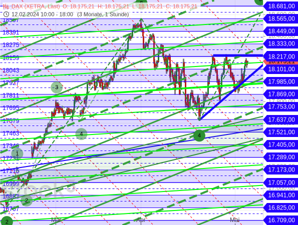 Dazu müsste der DAX aber nun zuerst in das Rechteck unterhalb von 18.270 Punkten zurückfallen. Dann wäre zumindest der bullishe Ausbruch aus dem aufsteigenden Dreieck auf neue Erholungshochs im Rahmen der Welle 5 hinfällig. Doch erst wenn die Kurse auch die Mittellinie bei 17.915 Zählern und damit das Tief des letzten Rücksetzers unterschreiten, nimmt das bearishe Elliott-Wellen-Szenario einer zweiten Abwärtswelle Form an.