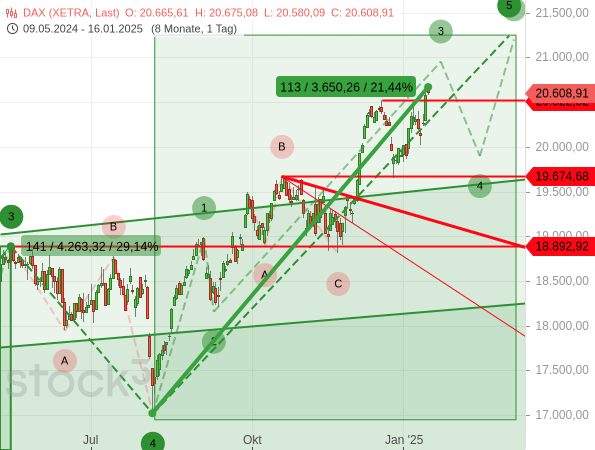 Zudem ist in diesem Chart ein Elliott-Wellen-Szenario zu sehen, welches ich kontinuierlich im Chartanalyse-Dienst „Target-Trend-Spezial“ verfolge. Auch dieses deutete seit geraumer Zeit noch auf ein neues Rekordhoch hin – im Rahmen der hellgrünen Welle 3 (siehe dazu auch „Neuer DAX-Rekord ist charttechnisch keine Überraschung“). Doch bei diesem Szenario ist bald wieder mit einem Rücksetzer zu rechnen – im Rahmen der hellgrünen Welle 4.