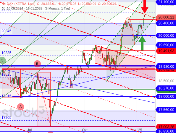 Jetzt stellt sich natürlich die Frage, wie weit die Aufholjagd den DAX noch nach oben treiben kann. Bei einem Anstieg über die Konsolidierungslinie wartet bereits die Mittellinie bei 20.755 Punkten als nächste Hürde. Wird diese übersprungen, kann es widerstandslos bis zur Rechteckgrenze bei 21.100 Punkten gehen. Auf dem Weg dorthin liegt mit der 21.000er Marke wieder ein psychologisch wichtiges Niveau, das die Aufmerksamkeit der Anleger auf sich ziehen kann. Einige Marktteilnehmer dürften hier wieder zu Gewinnmitnahmen neigen.