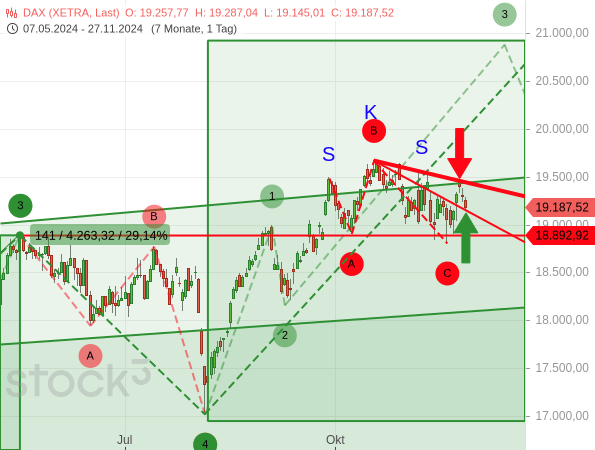 Das wilde Auf und Ab begann mit dem neuen Hoch vom 17. Oktober. Auf dieses folgte zunächst eine einfache ABC-Korrektur, die anschließend durch dynamische Auf- und Abwärtswellen immer komplexer wurde. Durch die vielen Überschneidungen hat sich aber kein impulsiver Abwärtstrend etabliert, sondern eine volatile Konsolidierung, die man durchaus als trendbestätigend betrachten kann.