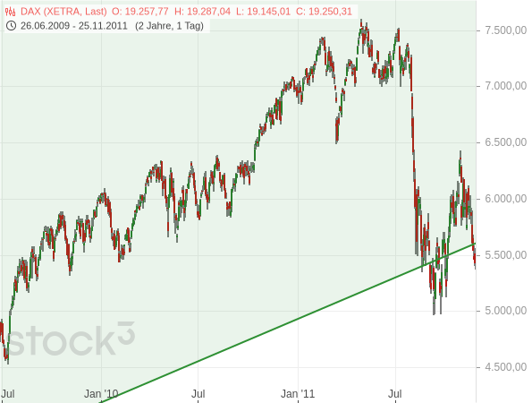 Und nun kommt es auf Folgendes an: Kann der DAX die dünne Linie verteidigen und wieder zulegen, wäre der bullishe Bruch dieser Linie von oben getestet und bestätigt. Gelingt bei dem erneuten Anstieg der Bruch der dicken Abwärtstrendlinie, scheint sich damit doch noch ein Ende der Konsolidierung abzuzeichnen.
