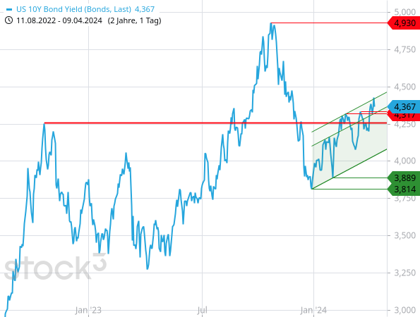 Die Anleihemärkte preisen dies dagegen zunehmend ein. Die Rendite der 10-jährigen US-Staatsanleihe ist zum Beispiel vorgestern auf 4,434 % gestiegen und wäre damit beinahe aus dem (erweiterten) Aufwärtstrendkanal nach oben ausgebrochen. Am Ende kam die Rendite zwar etwas zurück, so dass der Ausbruchsversuch scheiterte, der Trend ist aber weiterhin klar aufwärtsgerichtet.