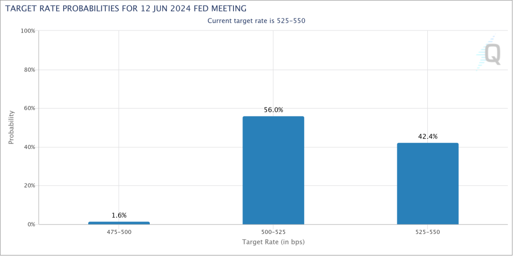 Und so verwundert es auch nicht, dass an den Terminmärkten eine Zinssenkung im Juni, die lange Zeit als gesichert galt, inzwischen nur noch mit einer Wahrscheinlichkeit von 56 % erwartet wird.