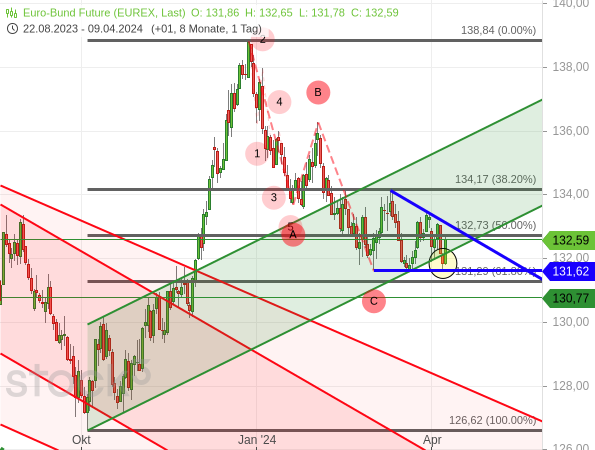 Aus fundamentaler Sicht dürfte dies aber an dem Übergang in eine Seitwärtstendenz bzw. später in eine moderate Aufwärtstendenz wenig ändern. Womöglich wird das Tief lediglich etwas niedriger liegen. Denn die Europäische Zentralbank (EZB) kann aller Wahrscheinlichkeit nach an ihrem Plan erster Zinssenkungen ab Sommer festhalten. Und das dürfte zu tendenziell sinkenden Renditen und somit steigenden Kursen am Anleihemarkt führen.