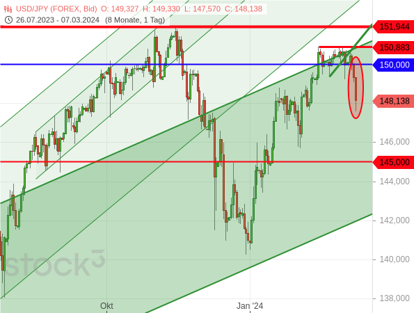 Diese Äußerungen schürten offensichtlich Markterwartungen, dass die BoJ bereits auf ihrer Sitzung am 19. März aus den Negativzinsen aussteigen könnte. Denn der Nikkei 225 brach gestern um bis zu 2,9 % ein und der Yen gewann deutlich an Stärke, vor allem gegenüber dem US-Dollar (siehe rote Ellipse im folgenden Chart).