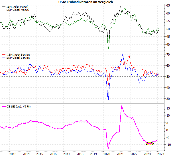 Bei den Dienstleistern sieht es zwar besser aus, aber der Gesamt-PMI für die USA von S&P Global schrammt im 2. Halbjahr 2023 zeitweise ebenfalls nur knapp an der Stagnations-/Rezessionsgrenze entlang. So ganz falsch liegt bzw. lag der LEI also nicht, aber er überzeichnet die Lage sehr stark.