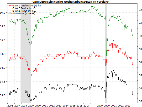 Der dritte Grund ist, dass auch die drittgrößte LEI-Komponente, die Wochenarbeitszeit in der Industrie mit allein 19,7 % Gewicht, negativ ist. Das ist erstaunlich, denn der starke Arbeitsmarkt bzw. der Arbeitskräftemangel, der daraus für die Unternehmen resultiert, sollte doch dazu führen, dass die (zu) wenigen Arbeitskräfte tendenziell mehr arbeiten (müssen), um die Arbeit zu erledigen.